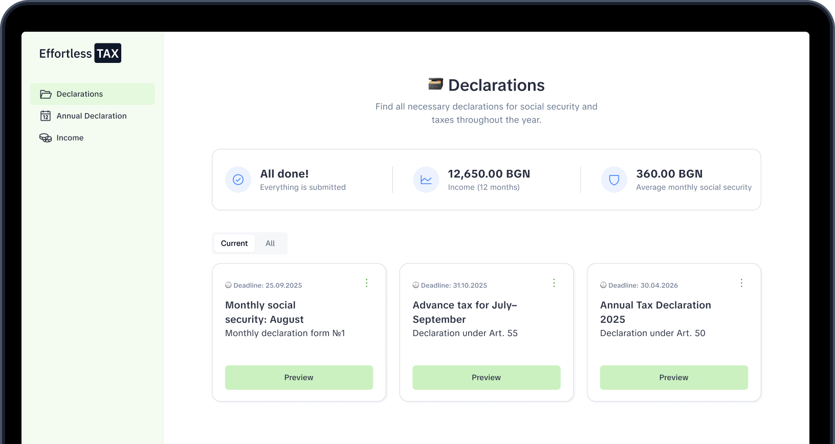 Effortless Tax is a platform created specially to meet the needs of professionals who work for themselves - freelancers, self-insured persons.